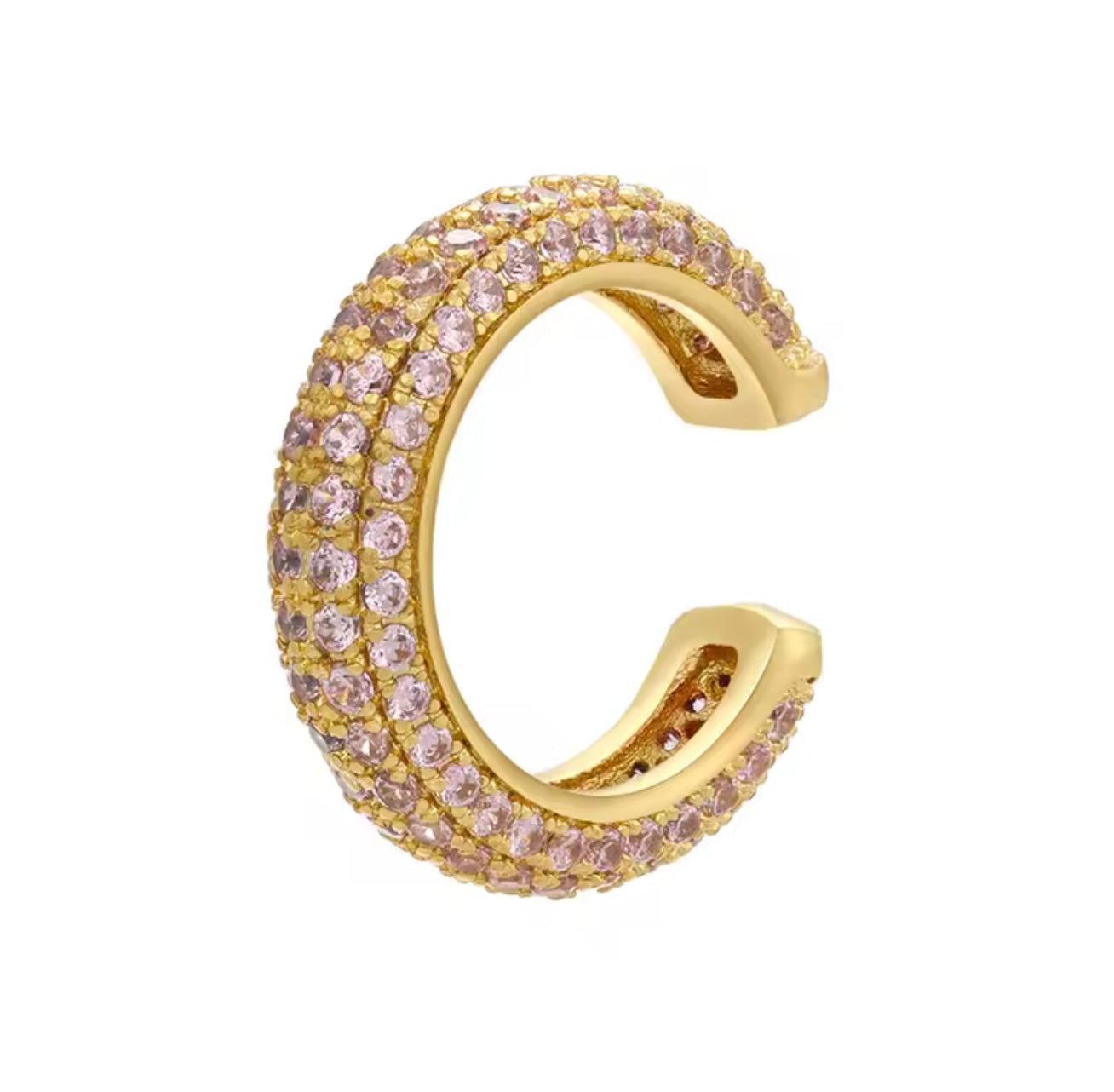 This 14K gold-plated C-shaped ear cuff features four rows of sparkling pink Cubic Zirconia stones — no piercing needed.
